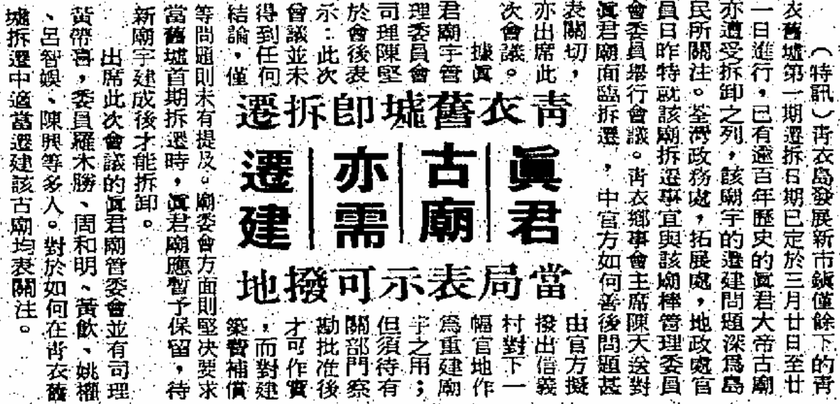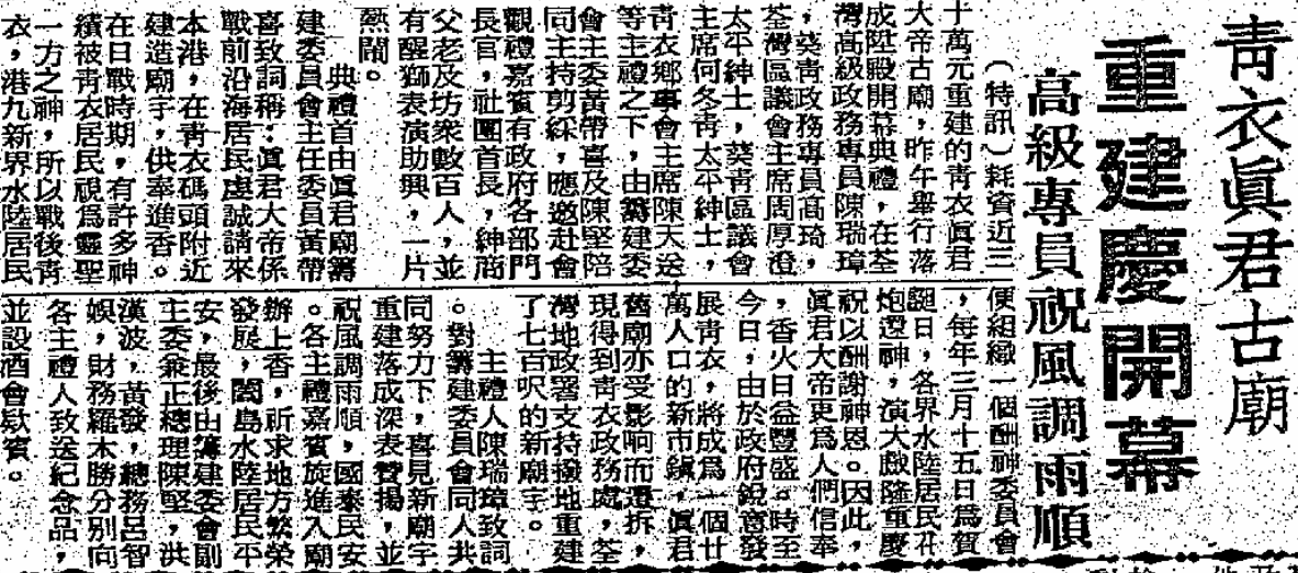 戰後真君廟曾於1955年重修、1959年擴建,位處當時新屋村(San Uk Tseun)附近(約為今日青衣公園之內,見圖一及二)。真君廟後來於1970年擴建 — — 此處以呂存中之口述資料為依歸,配合考證當時新市鎮計劃之地圖:屬於客家人的天后信仰,以「Tin Hau Temple」記錄,而新屋村附近有「Temple」字樣,由於青衣記載之廟宇亦不多,故此處應指真君廟。
