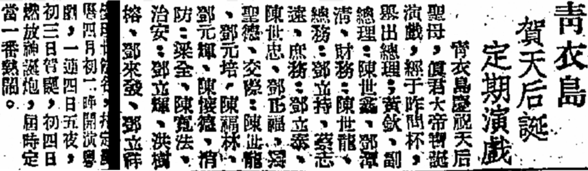 真君誕最早之記錄,為1958年《華僑日報》報導。歷年「真君誕」報導,主要包括五個部分,誕期及其組織、地點、達官貴人芳名、公演劇團、花炮活動及交通安排。從中便可了解當時青衣之情況。