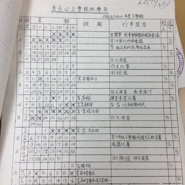 此外,呂存中(是次研究的口述歷史受訪者,詳見上篇)稱,其於1960年代就讀青衣公立學校時,每逢真君誕學校皆有假期;而據「1983/1984年度青衣公立學校之校曆表」,發現該學年擬訂四月十三日及十四日兩日為假期,並註明為「真君誕」(見圖二);有趣的是,島內原居民及漁民之「天后誕」則擬有四日假期。