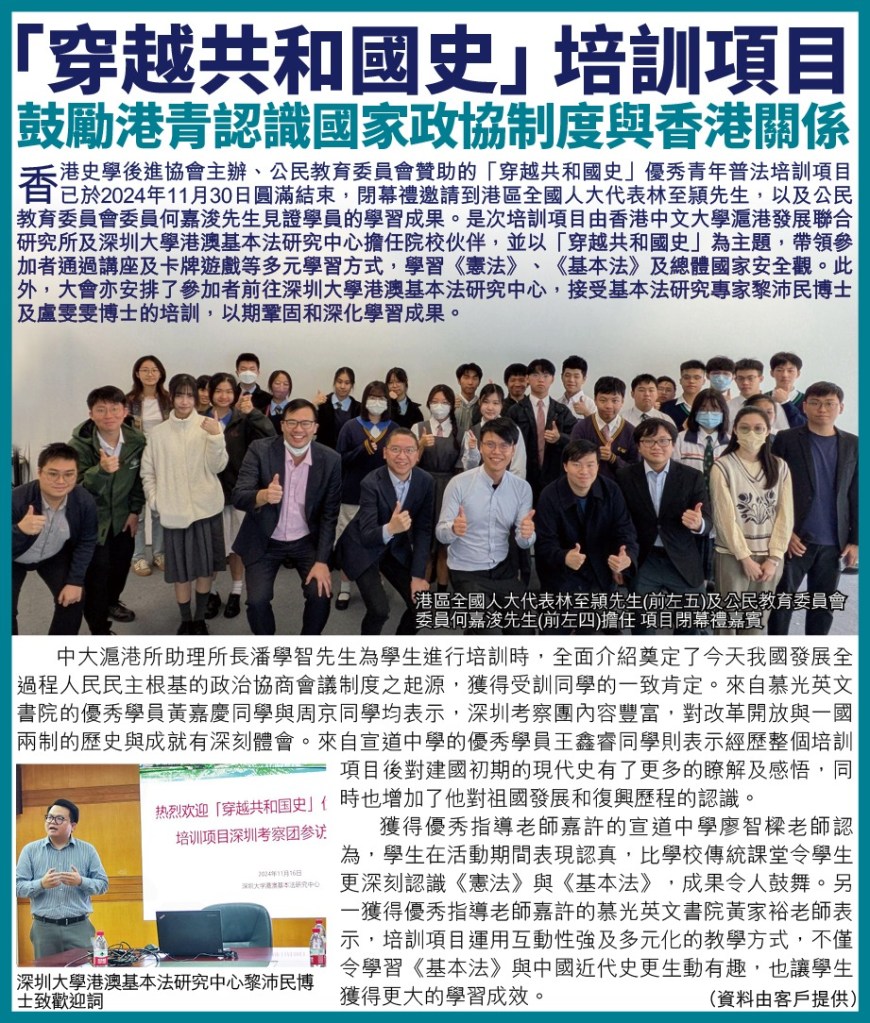 香港史學後進協會主辦、公民教育委員會贊助的「穿越共和國史」優秀青年普法培訓項目已於2024年11月30日圓滿結束,閉幕禮邀請到港區全國人大代表林至頴先生,以及公民教育委員會委員何嘉浚先生見證學員的學習成果。是次培訓項目由香港中文大學滬港發展聯合研究所及深圳大學港澳基本法研究中心擔任院校伙伴,並以「穿越共和國史」為主題,帶領參加者通過講座及卡牌遊戲等多元學習方式,學習《憲法》、《基本法》及總體國家安全觀。此外,大會亦安排了參加者前往深圳大學港澳基本法研究中心,接受基本法研究專家黎沛民博士及盧雯雯博士的培訓,以期鞏固和深化學習成果。